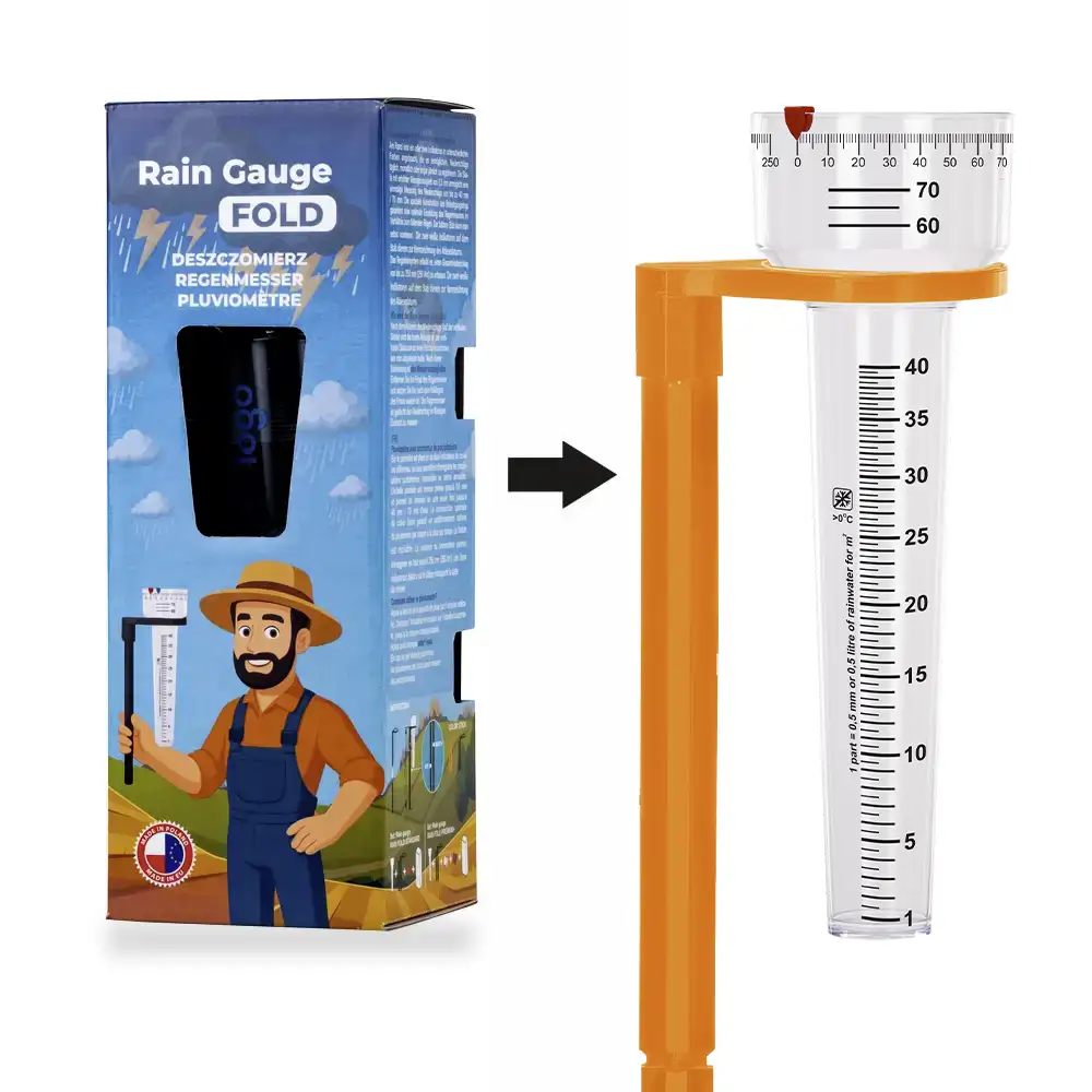 Le pluviomètre FOLD STANDARD peut être personnalisé par une impression durable en sérigraphie. Il devient ainsi non seulement un outil de mesure pratique, mais aussi un support publicitaire efficace, idéal pour les entreprises des secteurs agricole, horticole ou écologique.